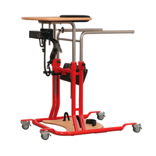 The Levatrain standing device has an integrated electric belt system and makes it easier to stand up while providing a stable support. The trapezoidal base frame and the pivoting rear wheels also allow the standing device to be used by patients with wider wheelchairs